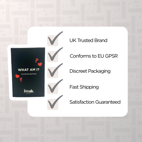 Get ready for endless laughs with Freak Geek's What Am I? card game! Perfect for a sexy night in with friends, this game challenges you to guess what you are while your partner gives you hilarious clues. Don't miss out on the fun - get your Freak on now!