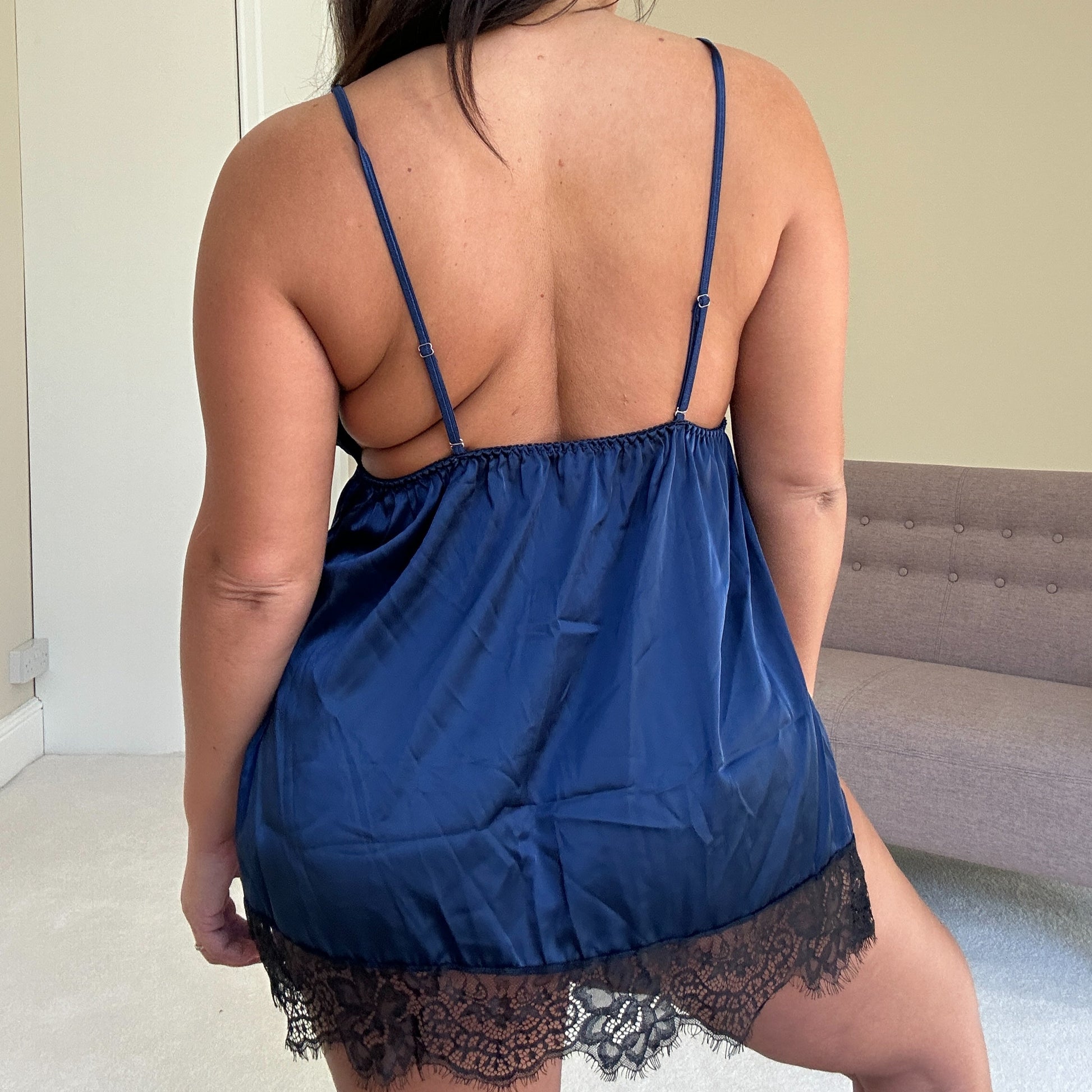 Delicate lace accents grace the bust and hemline, while a daring side slit adds a playful, teasing edge that promises to raise the temperature. Features a fully adjustable cross back.
