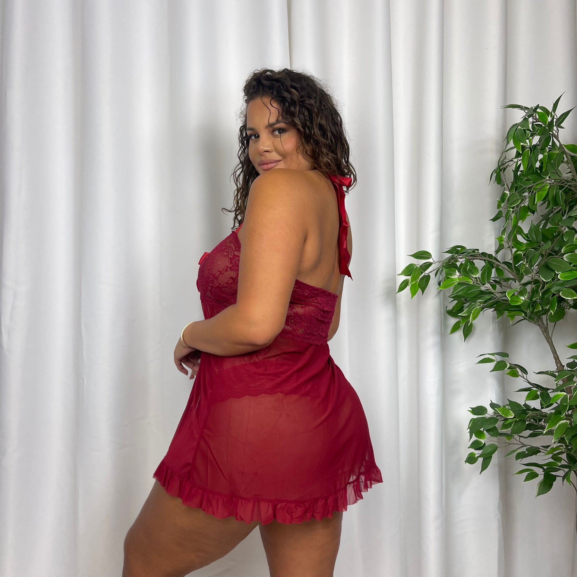 The lace panel is stretchy for comfort and support, and the frill trim adds a touch of seduction. Features fully adjustable halterneck tie ribbon and stretchy bust panel for a perfect fit.
